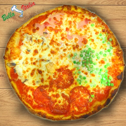 Paradicsomszósz, mozzarella sajt, sonka, gomba, szalámi, zöldborsó, oregano