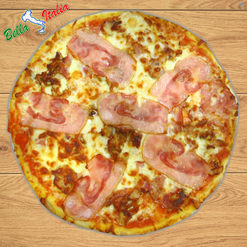 Paradicsomszósz, füstölt mozzarella sajt, csirkefalatok, tarja, császárszalonna, oregano