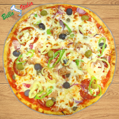 Paradicsomszósz, mozzarella sajt, szalámi, paprika, olívabogyó, kapribogyó, tonhal, vöröshagyma, csípős paprika