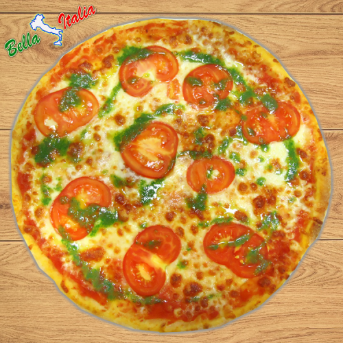 Paradicsomszósz, mozzarella sajt, friss paradicsom, bazsalikomszósz, oregano