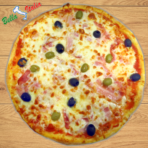 Paradicsomszósz, mozzarella sajt, bacon szalonna, zöld és fekete olívabogyó, oregano