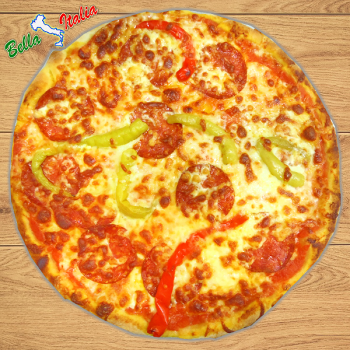 Paradicsomszósz, mozzarella sajt, szalámi, pfefferoni, oregano