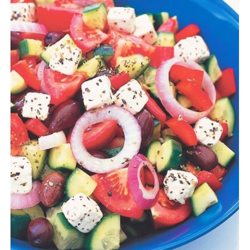 Uborka, paradicsom, lilahagyma, olívabogyó, olajos öntet, feta sajt