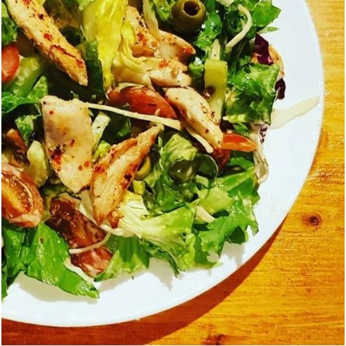 Jégsaláta, lilakáposzta, fejeskáposzta, uborka, paradicsom, csirkemell, olívabogyó, füstölt sajt, olívaolaj